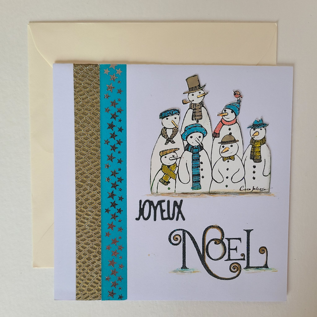 Cette petite carte double est fournie avec une belle enveloppe crème. Elle représente un ensemble de bonhommes de neige chaudement emmitouflés, légèrement colorisés et mis en relief.