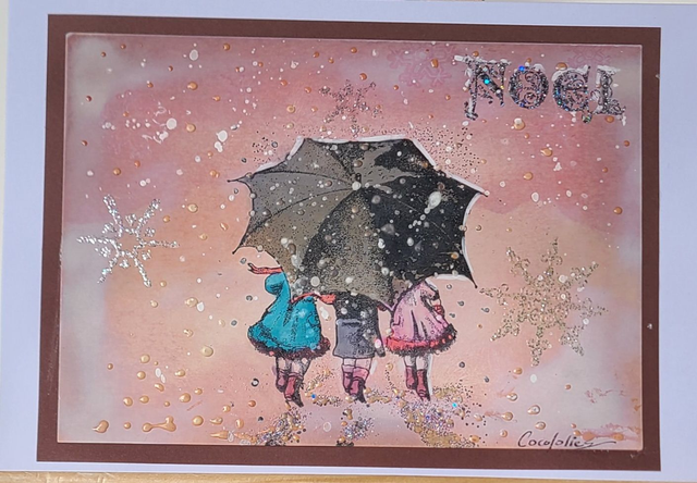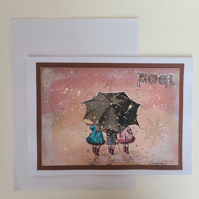Carte de Noël - 3 enfants sous un parapluie