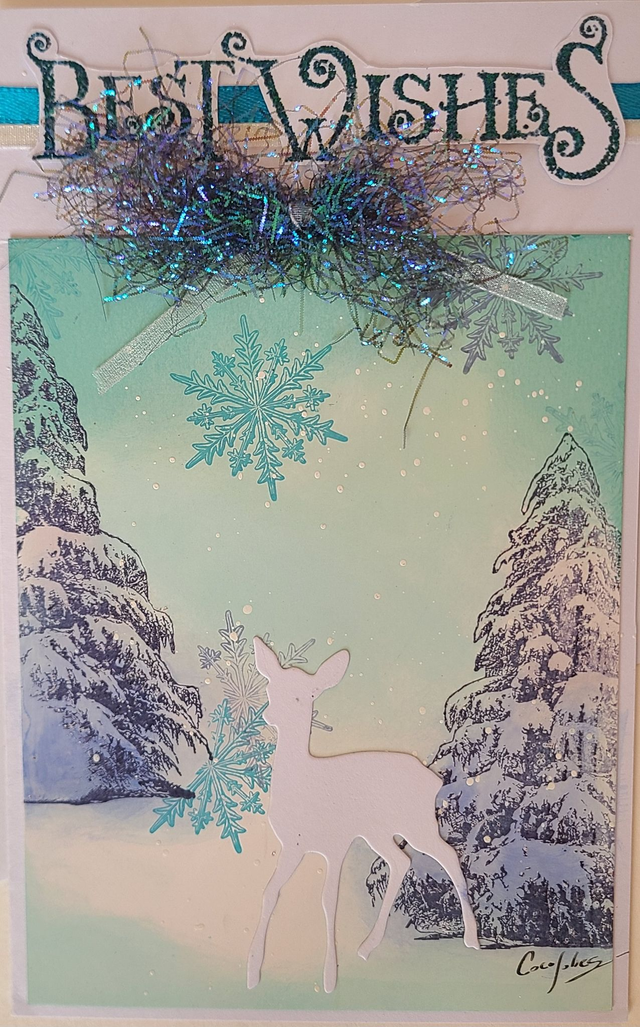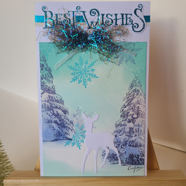 Cette carte double avec enveloppe fournie, représente une jolie scène hivernale.. Sur fond d'encres douces, de sapins et de flocons, un faon en léger relief observe le décor. Ajout de rubans et d'embellissements en complément.